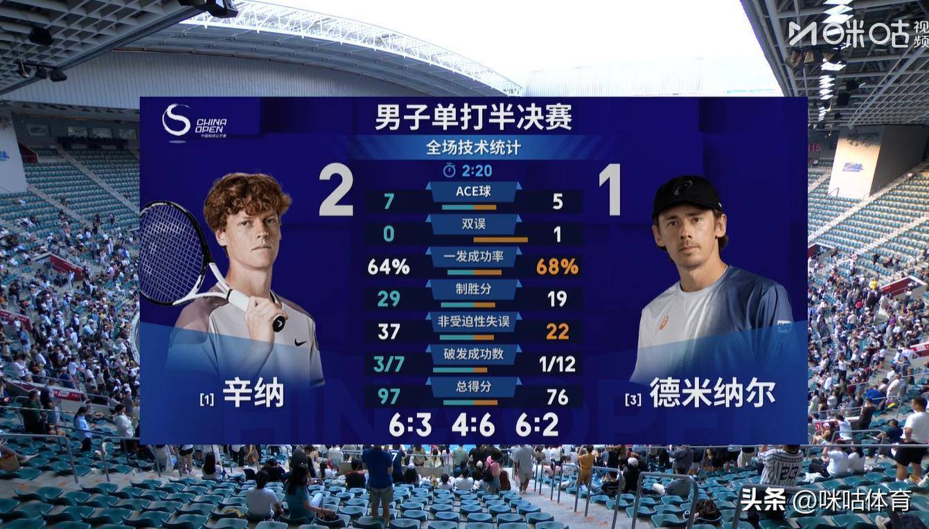 第三盘:辛纳相接完成2次破发,强势的以4比0开局,天然之后德米纳尔相接保住了两个发球局,但德米纳尔仍是无力回天,最终以2比6的比分丢掉了决胜盘,不但失去了晋级中网男单决赛的履历,在对阵辛纳的比赛中更是遭受了十一连败!