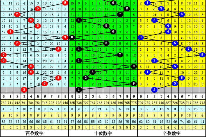 大中小分析:在组选0-9号码分散图中,前10期小 号(0-2区段)出现11枚奖号,中号(3-6区段)出现11枚奖号,大号(7-9区段)出现8枚奖号,上期0小 号区域断区,本期防大号转冷,瞻望7-9区段无号。